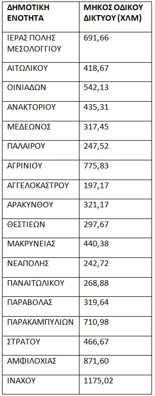 Το οδικό δίκτυο ανά Δημοτική Ενότητα στην Αιτωλοακαρνανία