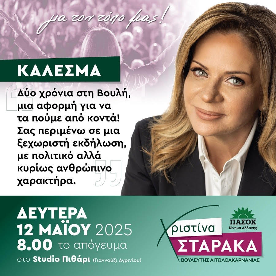 Δύο χρόνια παρουσίας στη Βουλή των Ελλήνων συμπληρώνει η Βουλευτής Αιτωλοακαρνανίας του ΠΑΣΟΚ – Κινήματος Αλλαγής, Χριστίνα Σταρακά, και με αφορμή αυτή την πορεία, προσκαλεί τους πολίτες σε μια ανοιχτή εκδήλωση απολογισμού, διαλόγου και ουσιαστικής επικοινωνίας.