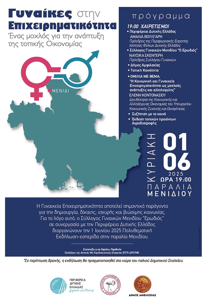 Ο Σύλλογος Γυναικών Μενιδίου «Ο Ερωδιός» σε συνεργασία με την Περιφέρεια Δυτικής Ελλάδας και τον Δήμο Αμφιλοχίας, διοργανώνει πολυθεματική εκδήλωση – εσπερίδα με τίτλο «Γυναίκες στην επιχειρηματικότητα», την Κυριακή 1 Ιουνίου.