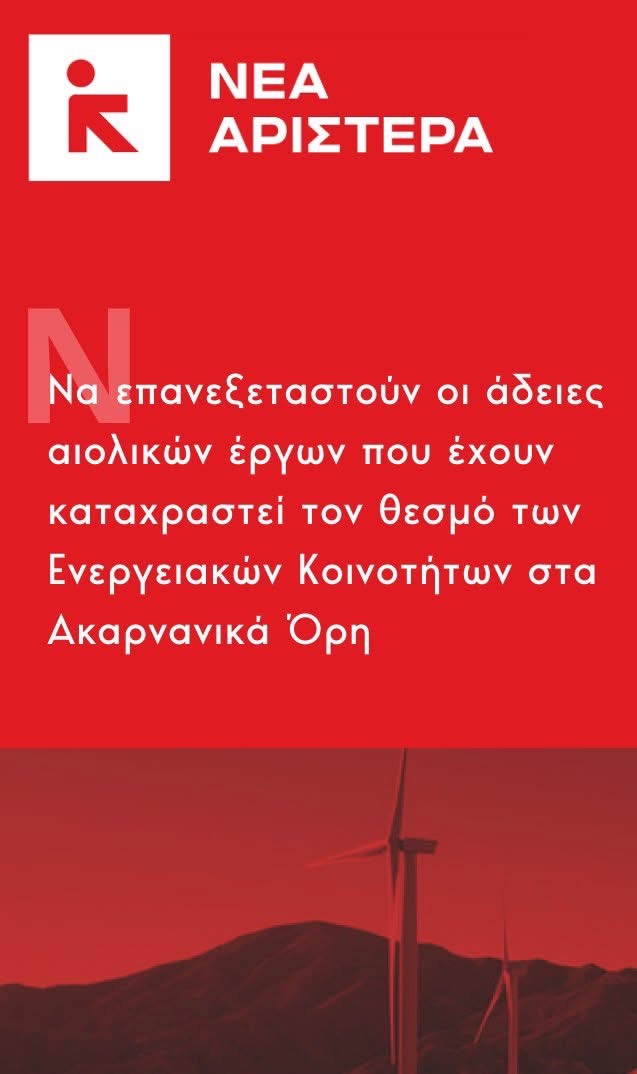 Η Νέα Αριστερά Αιτωλοακαρνανίας φέρνει στο φως μια σοβαρή υπόθεση καταστρατήγησης της νομοθεσίας για τις Ενεργειακές Κοινότητες (ΕΚΟΙΝ), με επίκεντρο τα Ακαρνανικά Όρη.