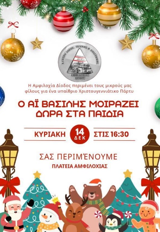 Πριν από τη φωταγώγηση χριστουγεννιάτικου δέντρου θα πραγματοποιηθεί υπαίθριο χριστουγεννιάτικο πάρτι για τα παιδιά με τον Άι Βασίλη και πολλά δώρα από το Κέντρο Λόγου, Τέχνης και Επιστήμης “Αμφιλοχίας Δίοδος”.