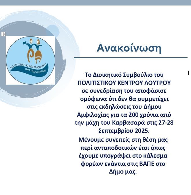 Aξιοσημείωτη ωστόσο είναι η στάση του  Πολιτιστικού Κέντρου Λουτρού που κάνει γνωστό πως δεν συμμετέχει στις συγκεκριμένες εκδηλώσεις του Δήμου εκφράζοντας «σταθερή θέση ενάντια στις ΒΑΠΕ» (Βιομηχανικές Ανανεώσιμες Πηγές Ενέργειας).