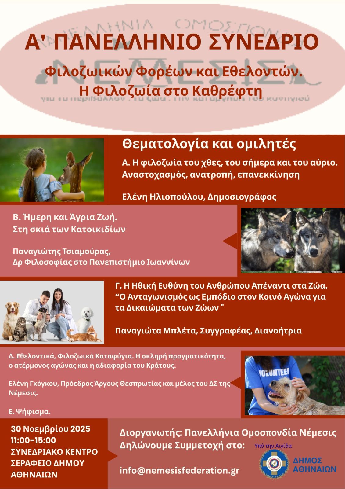 Το Συνέδριο με θέμα: “Η Φιλοζωία στον Καθρέφτη”, άνοιξε έναν ειλικρινή διάλογο ανάμεσα σε φορείς, φιλοζωικές συλλογικότητες και εθελοντές, αναδεικνύοντας τα αδιέξοδα, την ευθύνη των ανθρώπων απέναντι στα ζώα και τον ρόλο του κράτους. Στο πλαίσιο του συνεδρίου πραγματοποιήθηκαν εισηγήσεις από εκπροσώπους φιλοζωικών φορέων με επίκεντρο τη φιλοζωία του χθες, του σήμερα και του αύριο, τον ανταγωνισμό που λειτουργεί ως εμπόδιο στον κοινό αγώνα για τα Δικαιώματα των Ζώων, τα εθελοντικά, Φιλοζωικά Καταφύγια και την καθημερινή προσπάθεια συλλογικοτήτων και φορέων για την αποτελεσματική και άμεση φροντίδα των ζώων.