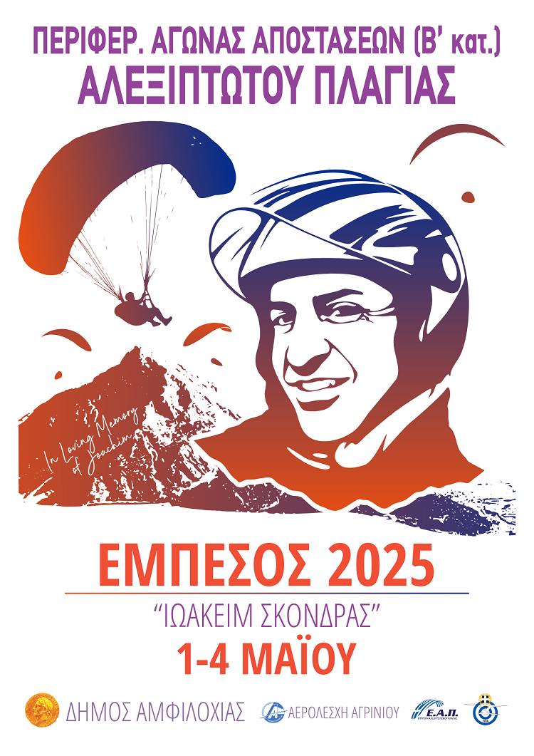 Έξι χρόνια μετά τον τελευταίο αγώνα στον Εμπεσό, όπου καταγράφηκε και το πανελλήνιο ρεκόρ απόστασης σε επίσημο αγώνα πρωταθλήματος, η Ελληνική Αεραθλητική Ομοσπονδία και το σωματείο «Αερολέσχη Αγρινίου» με την υποστήριξη του Δήμου Αμφιλοχίας διοργανώνουν ξανά στις 1-4 Μαϊου 2025 τον Περιφερειακό Αγώνα Αποστάσεων (Β’Κατηγορίας) Αλεξίπτωτου Πλαγιάς «Ιωακείμ Σκόνδρας», υπό την Αιγίδα της Ελληνικής Αεραθλητικής Ομοσπονδίας.