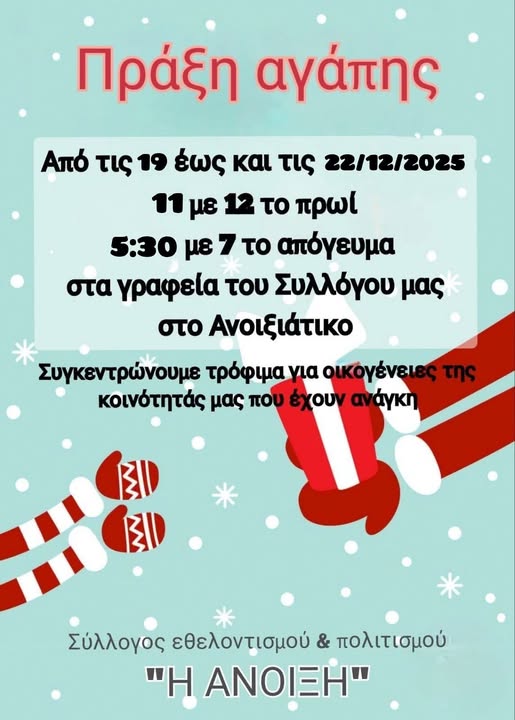 Για δεύτερη συνεχόμενη χρονιά ο Σύλλογος εθελοντισμού & πολιτισμού Τ.Κ. Ανοιξιάτικου «Η ΑΝΟΙΞΗ» οργανώνει «ΠΡΑΞΗ ΑΓΆΠΗΣ» με σκοπό τη στήριξη συνανθρώπων της κοινότητας μας που δυσκολεύονται να ανταποκριθούν στις καθημερινές τους ανάγκες.