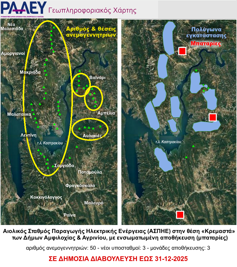 Σε δημόσια διαβούλευση έχει τεθεί από τις 24-10-25 έως τις 31-12-25 στο Ηλεκτρονικό Περιβαλλοντικό Μητρώο (ΗΠΜ) (https://platform.eprm.ypen.gr/#/applications/1879/aepo_creation) η Μελέτη Περιβαλλοντικών Επιπτώσεων (ΜΠΕ) του Αιολικού Σταθμού Παραγωγής Ηλεκτρικής Ενέργειας (ΑΣΠΗΕ) μέγιστης ισχύος λειτουργίας 112.5 MW με τα συνοδά έργα αυτού και με σταθμούς αποθήκευσης ηλεκτρικής ενέργειας, της εταιρείας «ΕΥΡΟΣ ΕΝΕΡΓΕΙΑΚΗ ΙΚΕ» πέριξ της τεχνητής λίμνης Καστρακίου, της Δ.Ε. Ινάχου του Δήμου Αμφιλοχίας και στις Δ.Ε. Παρακαμπυλίων και Αγρινίου του Δήμου Αγρινίου (στην μελέτη, η θέση του έργου αναφέρεται ως “ΚΡΕΜΑΣΤΑ”).
