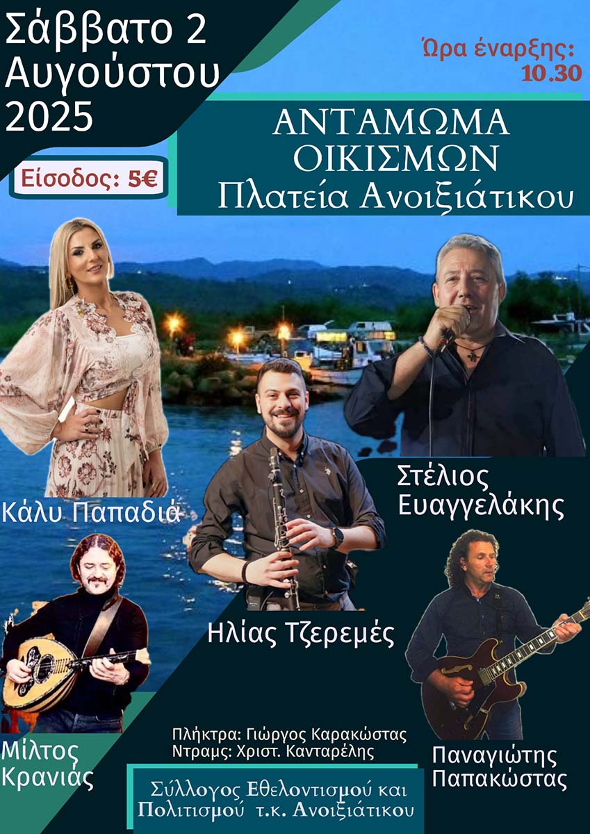 «Ο Σύλλογος εθελοντισμού και πολιτισμού ΤΚ Ανοιξιάτικου «Η ΑΝΟΙΞΗ» με χαρά σας προσκαλεί το Σάββατο 2 Αυγούστου 2025 στο 3ο ετήσιο αντάμωμά μας που θα πραγματοποιηθεί στην κεντρική πλατεία Ανοιξιάτικου (ώρα προσέλευσης 22:30).